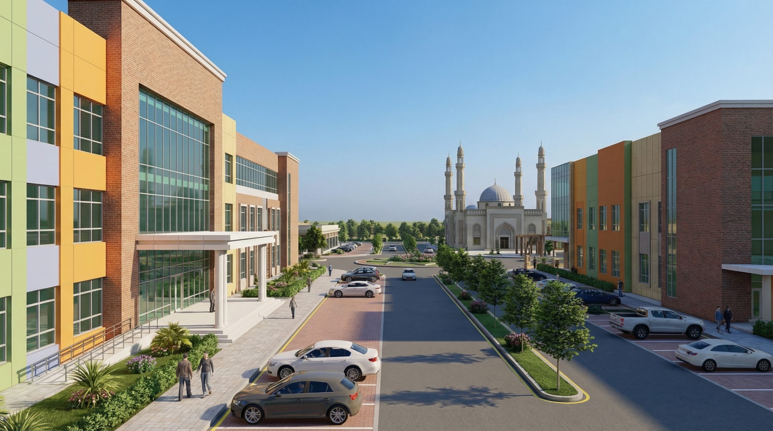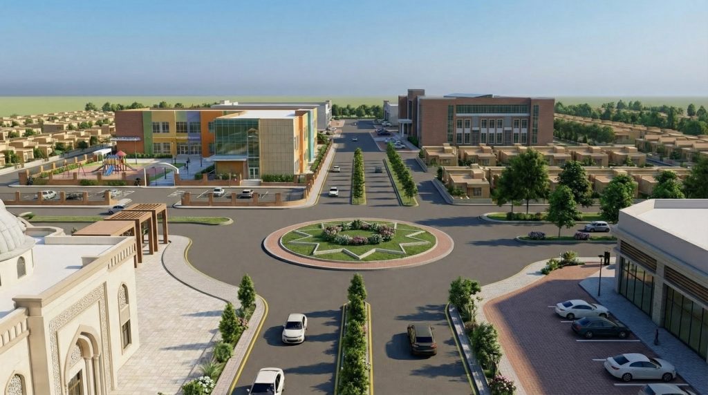 - الجامع و الاسواق التجارية تتوسط خريطة المشروع.